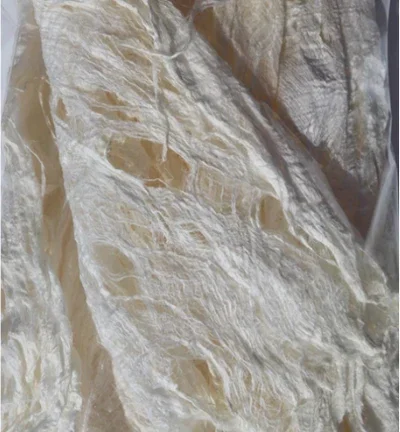 Gedroogde moerbeiboomschors, kan rechtstreeks in Powertex worden ondergedompeld. Powertex goed in de vesels wrijven, opentrekken en aanbrengen op het gewenste oppervlak.