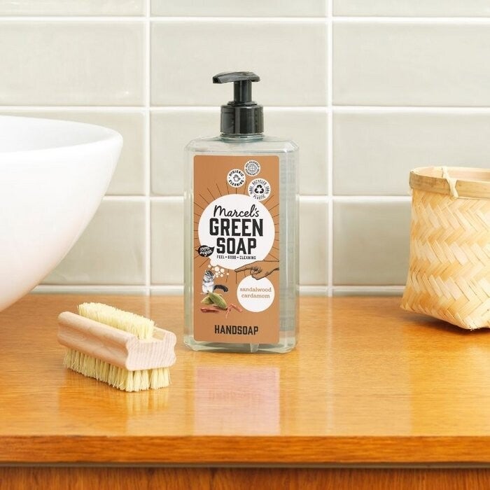 Marcel's Green Soap Handzeep Sandelhout & Kardemom is gemaakt van plantaardige zepen, minstens 97% biologisch afbreekbaar én verrijkt met essentiële oliën en extra glycerine voor zachte handen.