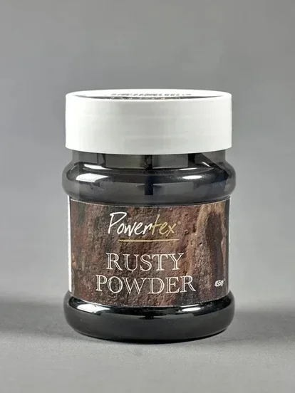 Kies bij voorkeur voor een lichte kleur Powertex zoals Ivoor, Gele Oker, Terracotta of Rood. Of meng Ivoor met de gekozen kleur Powertex. Smeer het object volledig in met een laagje Powertex naar keuze en laat drogen. Maak ondertussen in een beker een spatelbaar papje aan met Powertex +3D Sand. Voeg er tussen 10 en 25% Rusty Poeder aan toe tot een muis-grijze kleur. Voeg er een scheutje keuken azijn en een scheutje water aan toe en meng het weer. Breng een laag van deze pasta aan met een penseel of paletmes op het te decoreren object. Voor verschillende kleureffecten kan je ook een beetje van het poeder op de nog natte pasta strooien, wrijf deze telkens in de klei. Hoe meer rusty Powder, hoe donkerder het resultaat. Hoe meer azijn, hoe donkerder het resultaat. Vul een spray flesje met water en max 50% azijn en bevochtig daarmee regelmatig het object. (Meer azijn geeft sneller en donkerder roest effect) Opgelet: wanneer u de roest objecten buiten plaatst kan de ondergrond ook beginnen roesten door de zure regen die erop valt.