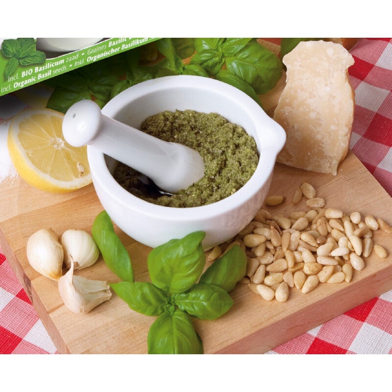 Met deze vijzelset kunt u uw eigen pesto maken.De set wordt geleverd met biologische basilicum zaden, aardetablet, zaai instructie en een pesto recept.